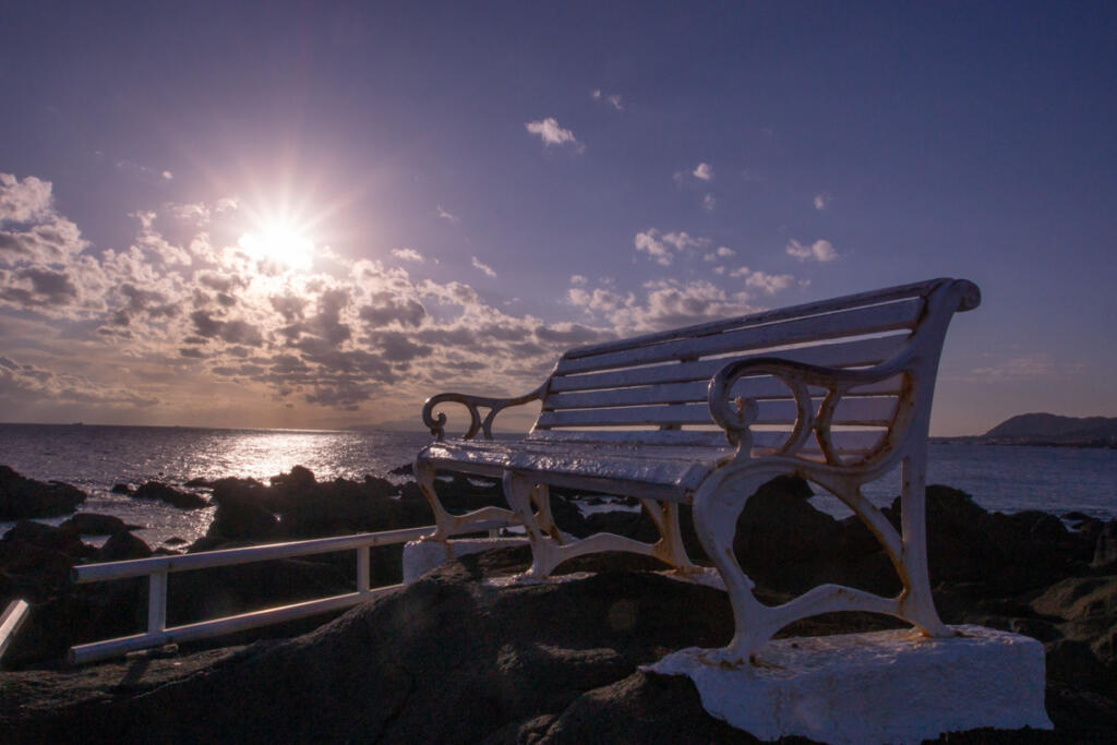 野島崎を象徴するのが、磯の岩場の上にぽつんと置かれた白いベンチ。「最果てのベンチ」あるいは「ラバーズベンチ」と呼ばれ、カップルで座ると幸せになれるという言い伝えもあるロマンチックなスポットです。