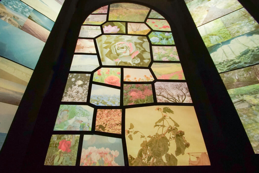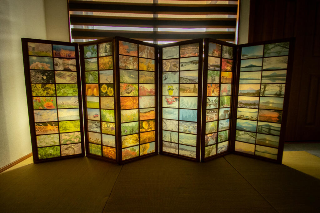 障子に透明な写真を埋め込んだ屏風作品では、 春夏秋冬、神社仏閣、そして富士山といった日本を象徴する情景を収めています。🇯🇵✨ 畳の上に配置された空間の中で、 柔らかな光が木枠からこぼれ、どこか懐かしい感覚を呼び起こします。それは単なる鑑賞ではなく、光と空間に包まれる体験です。また、隣接するステンドグラス作品とあわせてご覧いただくことで、西洋と日本、それぞれの「光の芸術」が静かに対話し始めます。